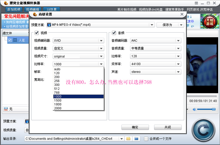 从上图中我们看到比特率中没有800,怎么办,也可以选择768或其它比特率,注意,这里可以随便输入一个数字的,你先选择1000,然后把1000删除重新输入800即可,如图: