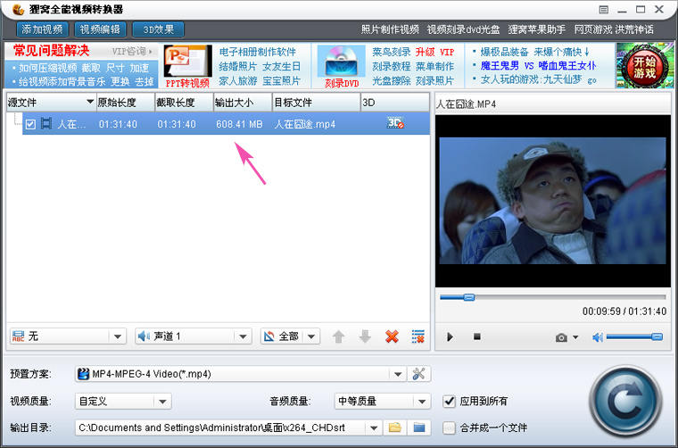 确定,再看输出大小,变成了608.41mb