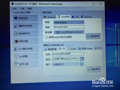 下载好镜像后,我们下载一个easybcd软件,推荐2.2的版本。安装后打开,在启动项里面点击添加新条目,在ISO内选择我们之前下好的Ubuntu的镜像即可