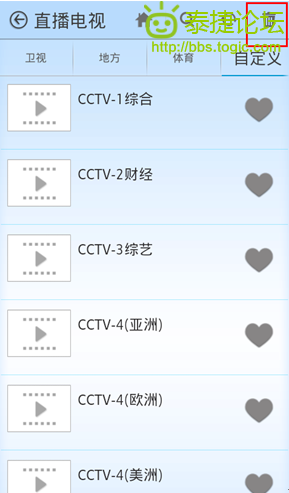 1、在手机上打开泰捷视频,点击直播电视进入直播界面,找到频道导航上的自定义,切换到自定切换到自定义频道列表(此时如果您还没有添加过自定义频道,这里会提示您到论坛下载自定义频道)。