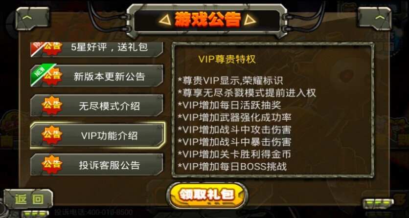 现在的各种游戏基本上都有着vip系统,通过不同的充值额度,可以获得对应的特权,暴击僵尸2015的vip可以为玩家们带来各种便利的功能,想要了解的朋友可以来看看。