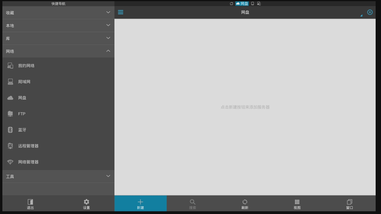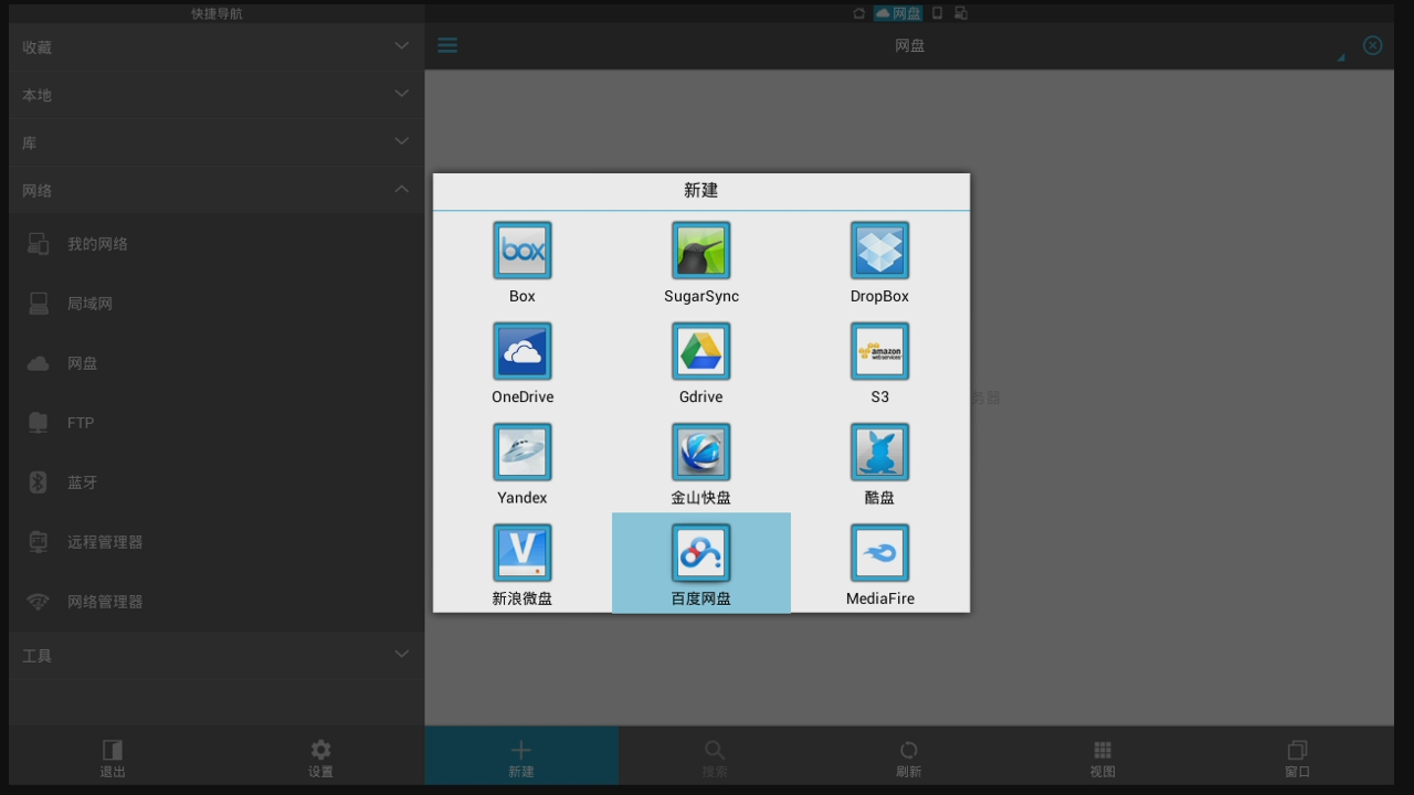 打开ES文件浏览器后,进入“网络”选择“网盘”后,我们要“新建”个网盘专区,选择“百度网盘”就可以确认了。