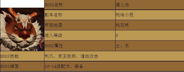 副本进入地点:桃花林找NPC-看门猫仔,传送至副本桃坞小苑讨伐BOSS猫儿怕。猫儿怕是10级前的一个任务,由于本人是3力2耐加的点数(带甲走向加法),8级的时候就一个人去做了。建议其他玩家到10级时再做,或者组队完成。以免产生悲剧。