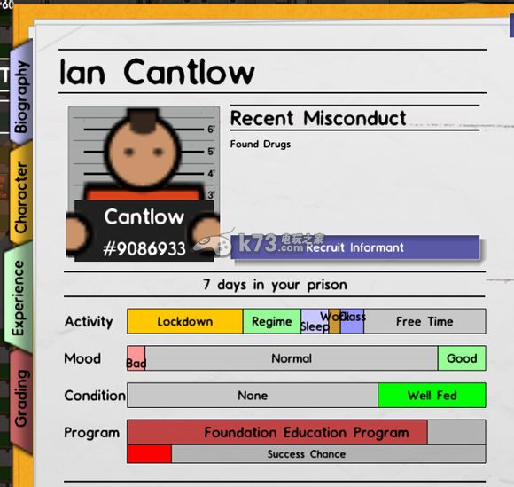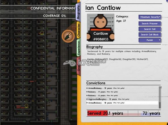 这时候大家注意,中间名单里的就是你的线人(我已经招募了一些了的),具体介绍的下面再说,先说这个状态下,你就可以看到你监狱里每个犯人的属性。