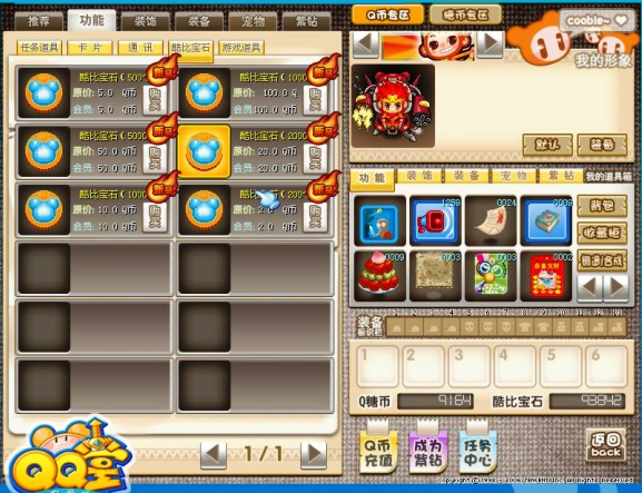 道具商店紧贴潮流,时刻保持最新的动态。层出不穷的新道具,美轮美奂,吸引每一个 糖果王国爱好者的全副精神。QQ堂道具商店中,所有道具都可以用酷比宝石购买。只要在购买的时候选择使用酷比宝石作为支付方式,就可以正式达到自给自足的境界。
