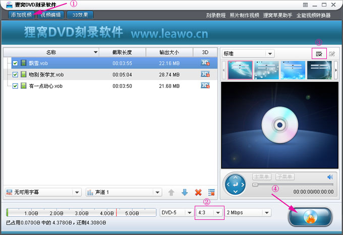 狸窝DVD刻录软件 ①添加VOB文件;②设置原视频宽高比4:3 ;③取消DVD菜单;④点击刻不设置