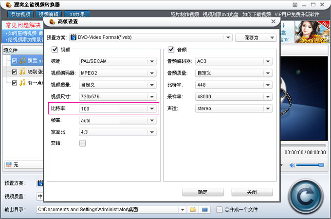 高级设置主要是把左边视频这边的比特率调小,因为我们刻录MP3音乐光盘是没有画面的,所以说视频画面无从谈起,就把比特率调小,记住:视频标准 是PAL、宽高比 是4:3;然后确定