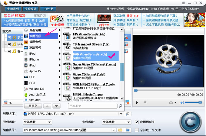 预置方案 - 常用视频 - DVD-Video Format(*.vob)
