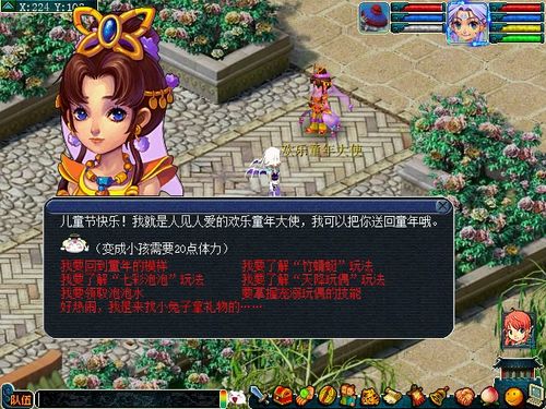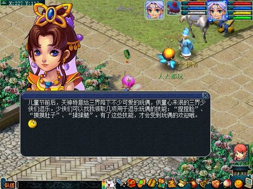 儿童节前后,天神特意给三界降下不少可爱的玩偶,供童心未泯的三界少侠们逗乐。少侠们可以找欢乐童年大使(长安城227,107)领取几项用于逗乐玩偶的技能:“捏捏脸”、“摸摸肚子”、“揉揉腿”。有了这些技能,才会受到玩偶的欢迎哦。