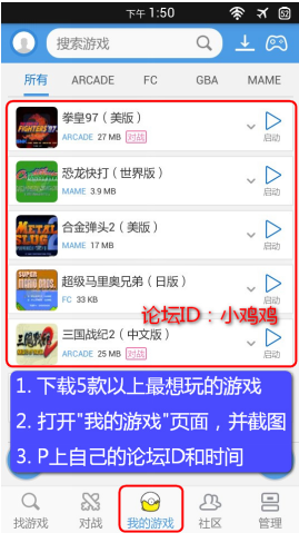 2、下载5款以上最想玩的经典游戏,打开“我的游戏”页,并截图,然后P上自己的ID (如下图),没有ID的截图视为无效;