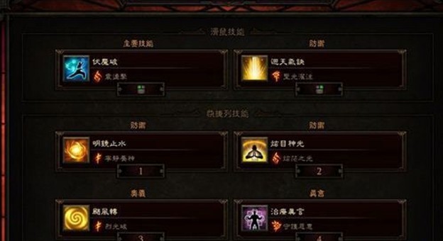 1技能留着保命逃跑 2和3技能用来控场和尽量的减少怪对你所造成的伤害 4技能之所以选择护盾雕文,看中的是5万血的武僧一个护盾吸收的伤害大概是7500左右 左键技能伏魔破配合吸血击中回生命的武器效果非常的好,右键的治疗精气回复用来提高精气获取,从而能不停的刷新护盾。