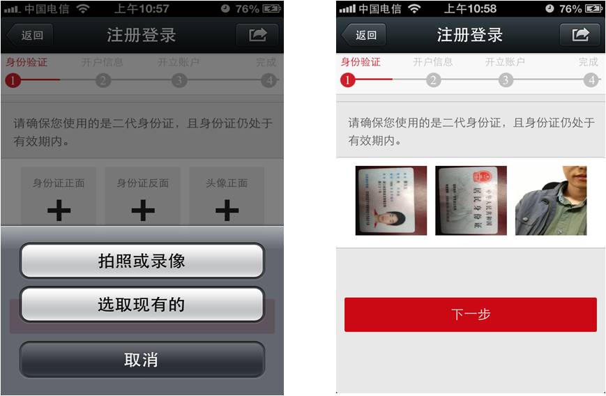 点“身份证正面”,跳出如下,可以拍照也可以到相册中选取现有的照片。