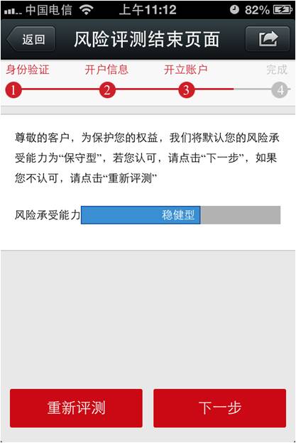 风险测评问题选择完毕,点下一步,跳出风险测评结果,再点下一步,进入回访问卷页面。