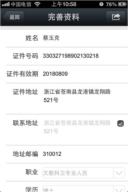 进入资料确认界面后,完善联系地址、邮编,选择职业和学历,提交后将用户身份证信息提交公安部进行身份验证,验证通过后进入后续开户步骤。