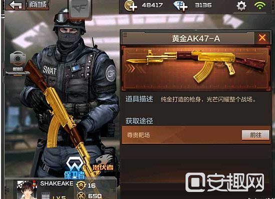 黄金AK47不禁代表着尊贵与霸气,它更代表着男人那追逐梦想的心。AK系列的钢是众所周知的,即使配备防弹头盔也可以轻松破防,只要枪够钢只要枪够狠就一定能够带你走向胜利。