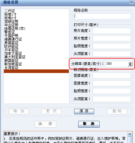 点击菜单栏中“系统设置-证照规格设置”按钮,点击“增加”按钮,添加新的规格名称,并设置其分辨率。