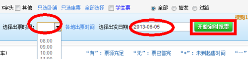 这个功能是很给力的。因为每一个火车站出票都是有时间规定的。比如T96从深圳到武汉,目前是深圳站是8点开始的。那么你就可以设置一个8点开始抢购,如下图,点击“开始定时抢票”,设置抢票日期和抢票时间。注意了,如果选择时间段的时候,时间段是灰色的就表示不能选择。