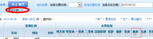 第一:你要设置好需要购买的什么座位再刷。例如,你就想刷一张硬座票怎么办?很简单,在余票信息那里只勾选“硬座”,如下图,勾好了再点击“开始刷票”。