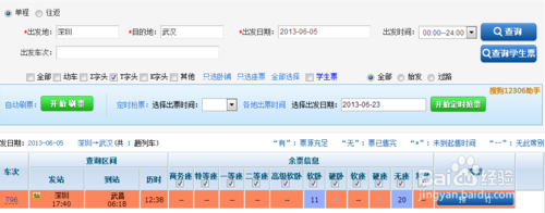 进入后,你会看到经过优化后的买票页面。如下图。下面要重点讲的就是图中的红色框住部分的“开始刷票”和“定时抢票功能”,是他们才能帮助我们抢票。下面将会分开说。这里举的例子是购买6月5日(明天)深圳开往武汉的一列T字开头火车:T96。