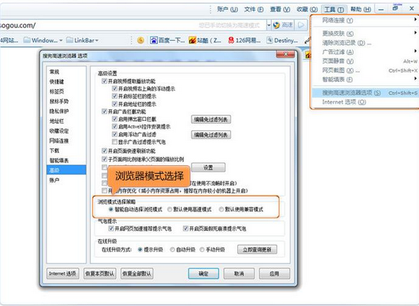 搜狗高速浏览器默认使用智能选择内核的模式,帮您选择最适合您的内核,保证网页正常显示的同时速度最快。您也可以在搜狗高速浏览器设置中重新设置,点击菜单栏工具项,然后点击搜狗高速浏览器选项,在弹出的搜狗高速浏览器选项对话框中选择高级,找到浏览模式选择策略,选择您所想要的浏览模式即可,如图所示。
