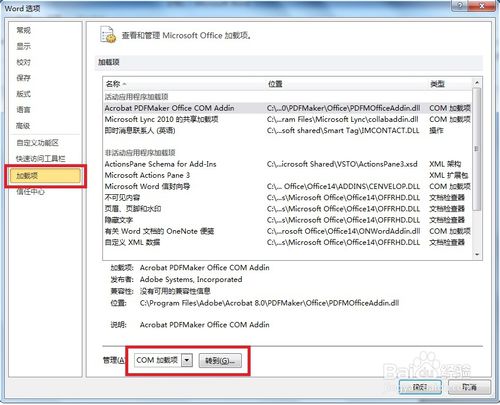 在弹出的“WORD选项”中,选择“加载项”,将下方的“管理”旁选择“COM加载项”,点击“转到”