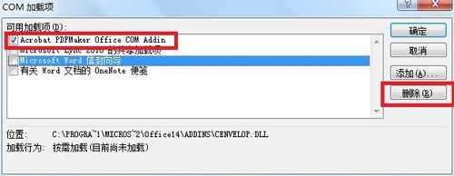 在弹出的对话框中,只勾上"Adobe PDFMaker Office COM Addin",点击删除,然后确定。再打开WORD文档时就不会出现提示加载Adobe acrobat,至此,问题已解决。