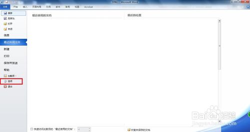 打开任意一个WORD文档,选择标题栏的“文件”,然后在出现的菜单中点击“选项”,如下图