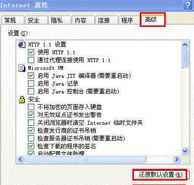 6.检查是否有什么程序或者设置拦截了3合1的数据包发送和接收。去掉即可。最好还原一下IE默认设置,安全和高级里(如下图)