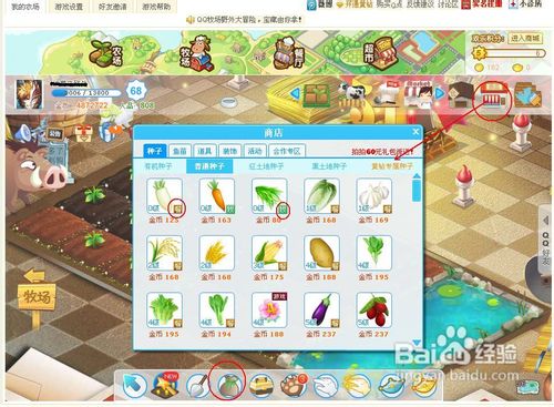 5、下来要进行播种咯,点击右上方的商店,可以购买种子,在点击下方袋子样的种子袋,选择要播种的种子,再点击空的土地,就可以播种了。大家可以看到,种子分为好多类,红土地和黑土地的种子收益高,普通种子里,有的右下角写着“牧”,是可以再QQ牧场给动物使用的,有的写着“餐”字,是可以再餐厅当做食材用的(比例为1:100)。