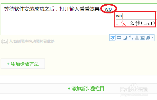 7等待软件安装成功之后,打开输入看看效果。wo拼音是我,五笔是伙!!!也就是说这款软件可以打五笔和拼音两种输入法。