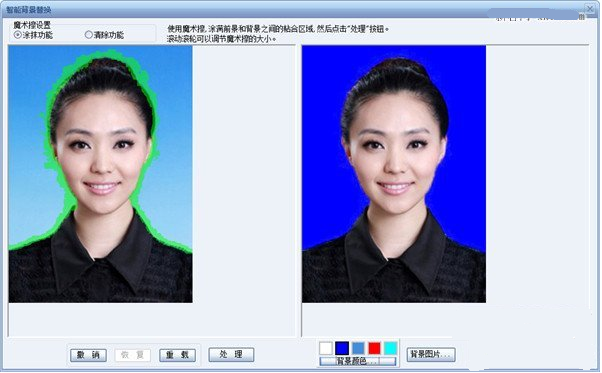 通常情况下,证件照会对背景有一定的要求,为证件照替换背景这个步骤也很简单,点击“背景处理”,然后软件会自动分离前景和背景,然后选择合适的颜色或者背景图片即可。