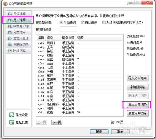 选择用户词库,可以看到列表中有很多词条,在右侧选择导出当前词条