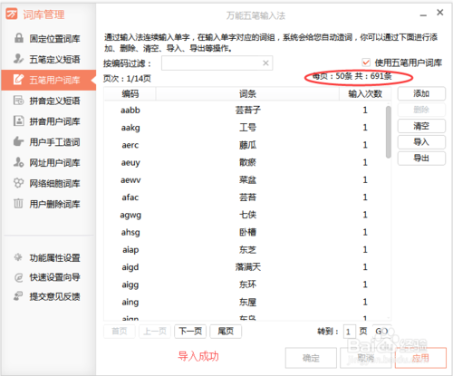 最后我们会看到QQ词库中的词条已经被成功导入了,用万能五笔的同步功能同步之后,在其它电脑上登录您的帐号也能用这些词条了