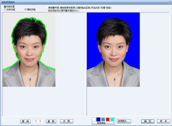 4.替换背景。点击“背景处理”,利用对话框中的涂抹功能和清除功能,替换背景颜色或者背景图片。