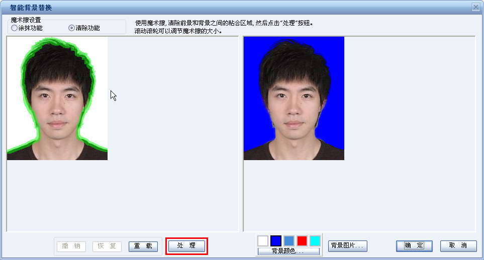 设定待处理照片目录和保存目录,点击“导入照片”,窗口上出现相关证件照列表。双击照片缩略图,界面上即跳出“智能背景替换窗口”,根据提示进行魔术擦设置。