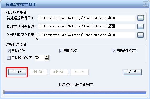 第三步,点击“批量证照制作在”选项,界面上出现”标准1存批量制作“对话框,证照之星软件默认了照片批量修改的格式,也就是“标准一寸制作”。在对话框里面设定标准一寸照片批量制作的各项参数,比如照片来源,保存路径,选择处理项目为是否自动选择、自动裁切等。设置完毕点击“开始”按钮!