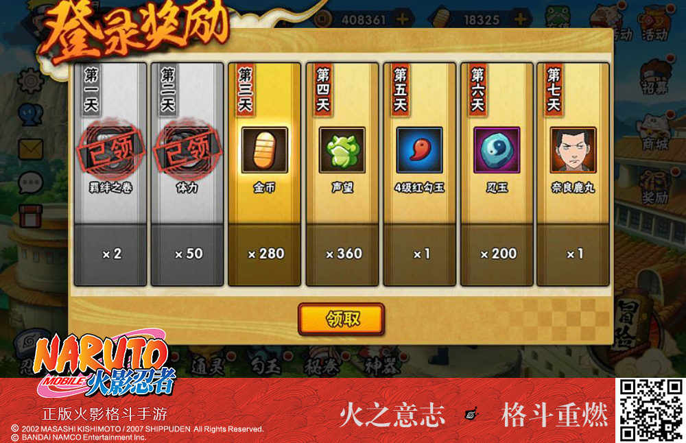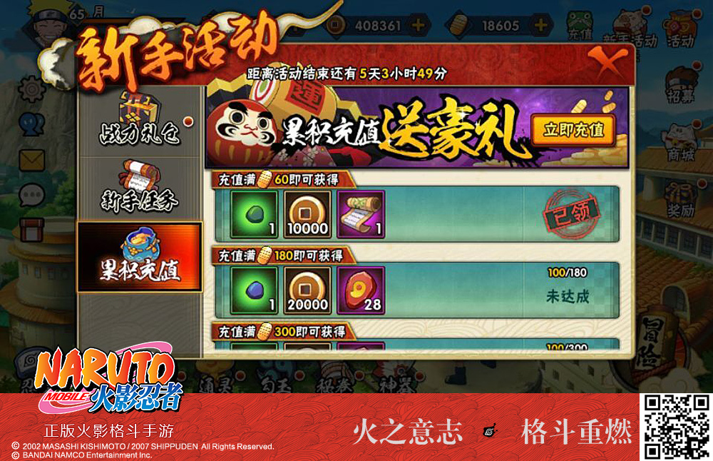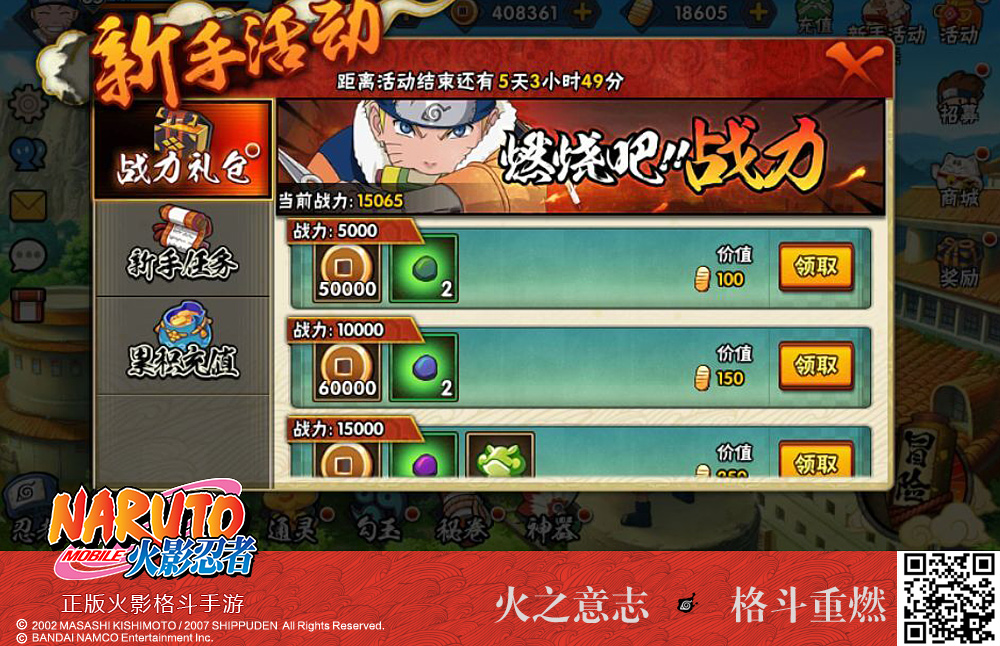 活动内容:玩家战力达到指定高度,即可领取丰富奖励(大量铜币、勾玉、声望、忍玉等)。