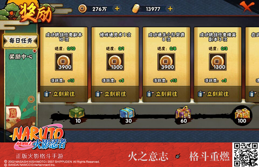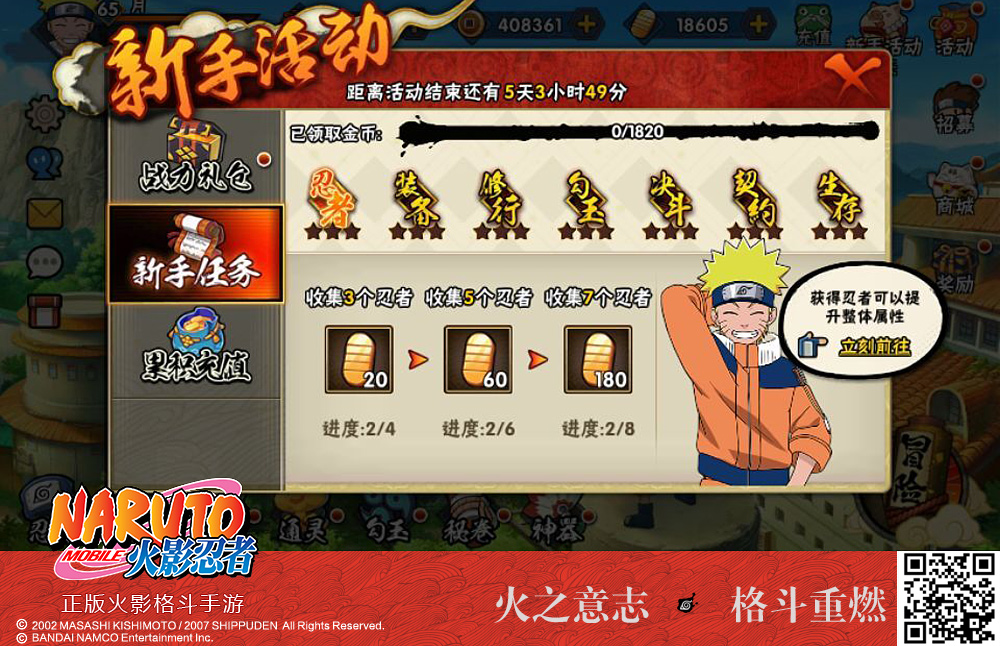 活动内容:先遣体验测试期间,玩家完成游戏提供的收集忍者、强化装备、修行之路闯关、收集勾玉、参与决斗场、升级通灵兽忍犬、生存挑战通关等新手任务即可获得海量金币奖励。