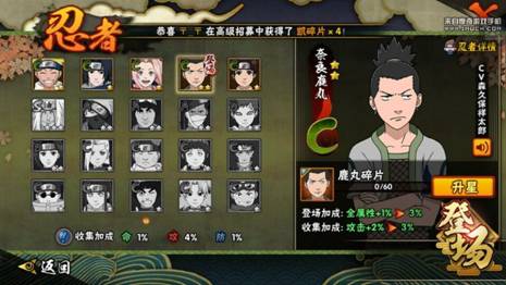 本作的画面和战斗做得非常让人满意,不过忍者系统却是一个让大家诟病的地方,主要原因就是忍者获取途径太少,游戏中的忍者目前分为S、A、B、C级,每个忍者都可以收集碎片升到5星。
