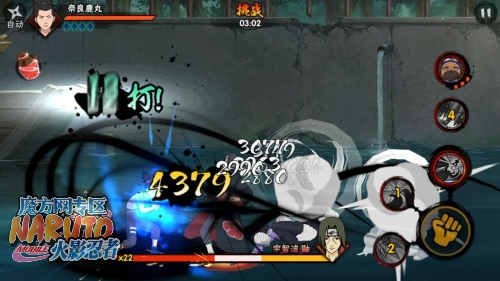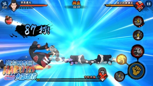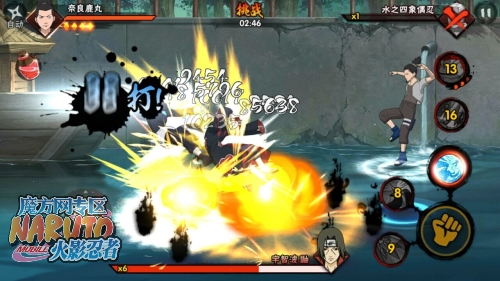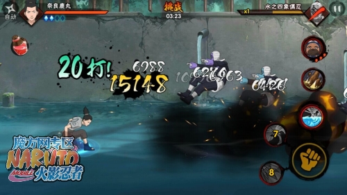 首先面对杂兵的时候,水龙弹加上另外一个四象杂兵释放的技能会让玩家一旦被击中就会丧失大量的HP,唯一的方式就是一波流带走,切不可留下一个敌人在后背,否则机会造成极大的干扰,所谓一波流就是敌人在右边我方在左边,,不能让左右两边都有敌人,形成一个有效的一波流,非常推荐鹿丸作为本关的闯关者,优秀的技能控制能够在一波流之中毫发无损的干掉前期棘手的小兵。