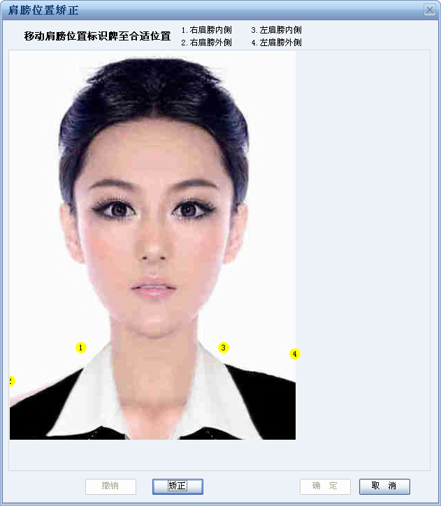 第三步:移动肩膀位置标识牌至合适位置,然后点击“矫正”按钮来矫正肩膀位置。在调整肩膀高低的时候,主要是移动标识牌2的右肩膀外侧和标识牌4的左肩膀外侧,上下移动到合适位置点击“矫正”,如果一次没有矫正平衡,点击“撤销”再次调整标识牌位置,直到矫正到照片左右肩膀平衡。