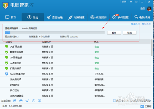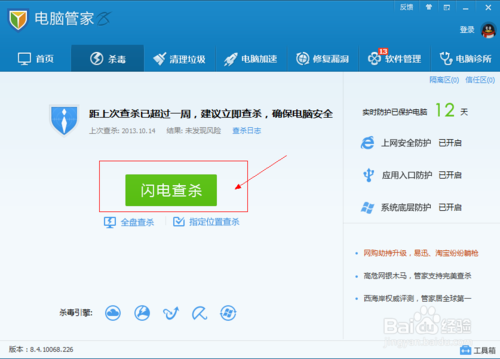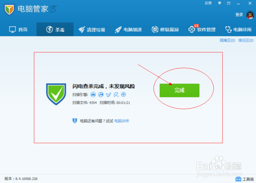 如果查杀后出现病毒点击立即查杀没有点击完成