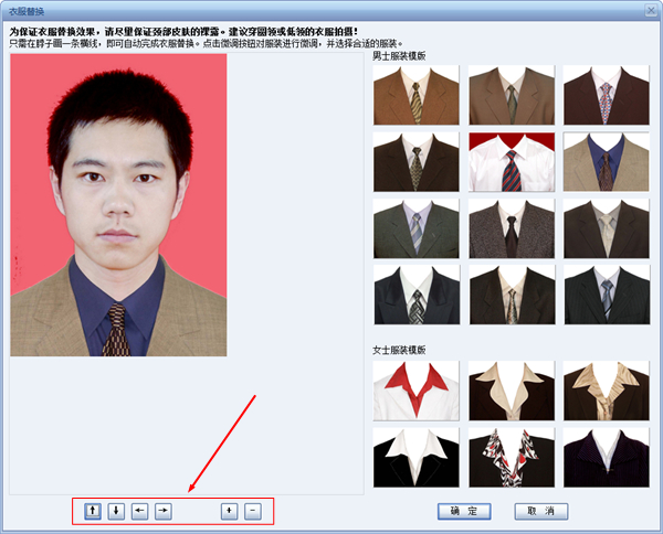这里有很多证件照用模板供大家选择,而且还进行了男士和女士分类,以便于使用者进行选择。我们根据需要选择其中一套衣服,然后按照软件提示,在证件照脖子处画一条横线,这样就可以完成替换工作啦!