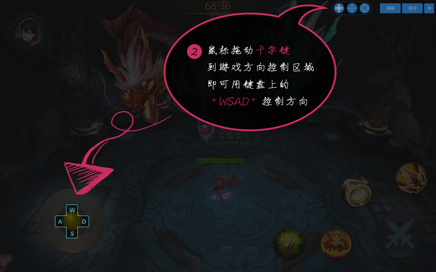第二步,用鼠标将十字方向键拖动到游戏的摇杆上,就可以用WSAD随意控制方向了
