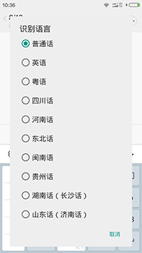 点击上图中普通话按钮,可选择语音输入使用的语言,目前支持粤语、四川话、河南话、东北话、闽南语、贵州话、湖南(长沙)话、山东(济南)话、山西(太原)话、陕西(西安)话、江西(南昌)话、上海话、天津话、南京话、武汉话、合肥话方言识别。如下图所示。