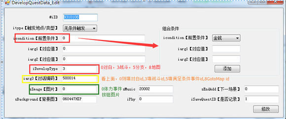 3代表分支触发,ICondition肯定要设置条件的。iDevelopType肯定是填5,满足条件跳转IArg3事件,不满足则跳转sEndAdd事件。