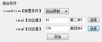 右边组合条件这里是给左边前置条件服务的,右边选好了条件之后,点添加,就在左边生成了前置条件,例如我先限定触发的回合数,右边组合条件这里选回合限制,之后就可以直接选择回合了,十分方便,我选择了初始回合开启闲逛和忘忧谷的5月下旬,终止回合倒数第二个: