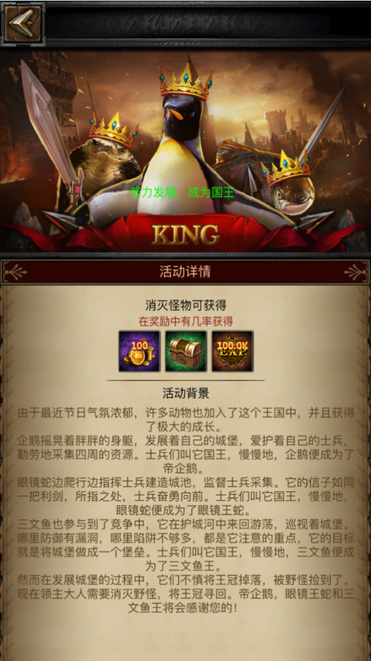玩家需要在游戏中消灭各种野外怪物,然后就有一定的几率获取各种各样的宝箱,玩家可以获得宝箱有三种,分别属于帝企鹅、眼镜王蛇和三文鱼王,玩家打开宝箱就可以获得来自帝企鹅、眼镜王蛇、三文鱼王的丰厚奖励。