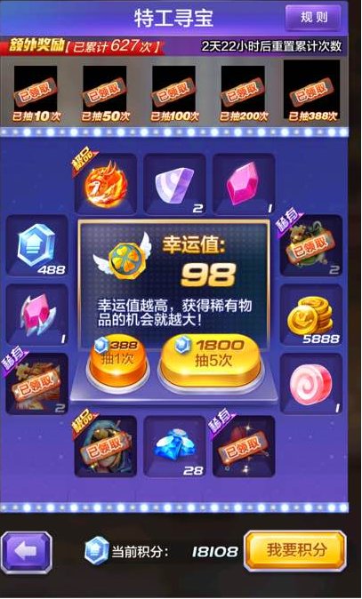 在游戏中通过不停的抽箱子可以累积幸运值,幸运值越高获得稀有物品的几率也会提升。