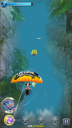 如果不失误的话,在1000米多一点的距离就可以收集完三星所需的动物头了。开局奔跑不远就会开始滑翔,吃下磁铁后按照黄星指引的道路滑动就行了,偶尔会有点障碍,但是躲避难度并不大。落地后注意观察前面的路况就行,过了独木桥之后走最左边,上高台后开启滑翔伞可以吃三个动物头,但是会漏掉地上一个,不过并没有关系,相比之下,我们已经赚了不是吗?